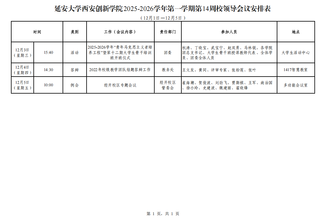 延安大学西安创新学院2025-2026学年第一学期第14周校领导会议安排表