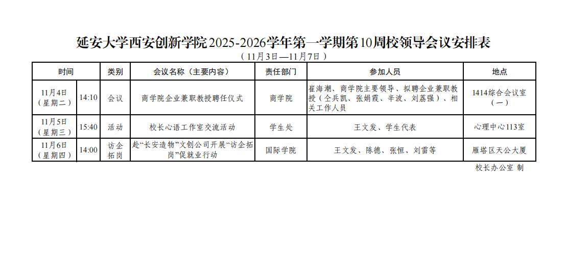 延安大学西安创新学院2025-2026学年第一学期第10周校领导会议安排表