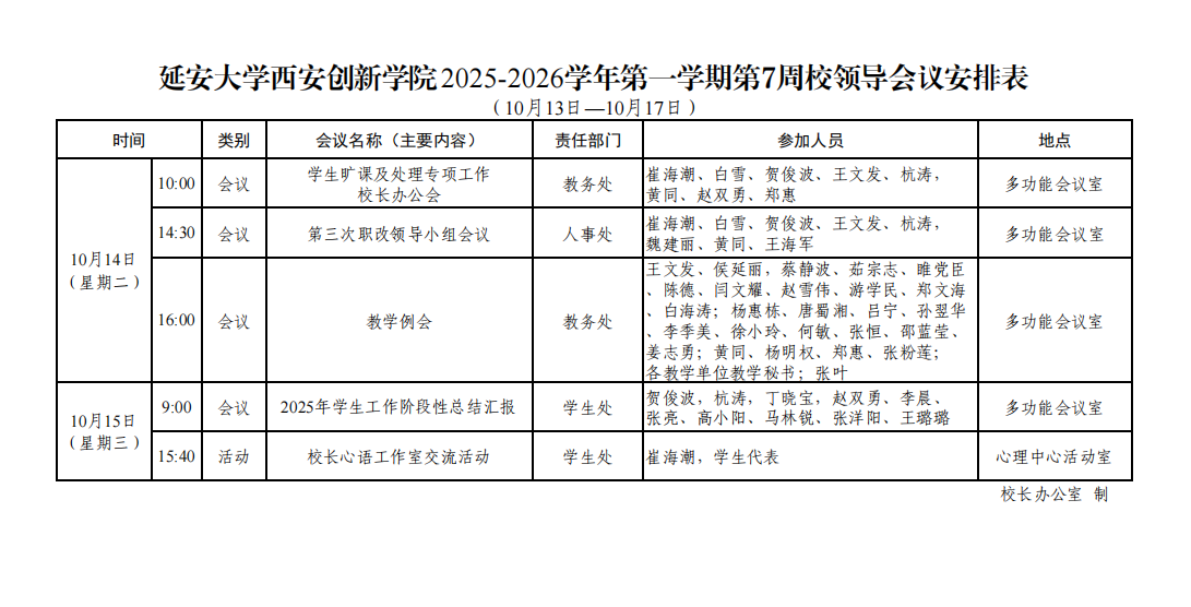 延安大学西安创新学院2025-2026学年第一学期第7周校领导会议安排表